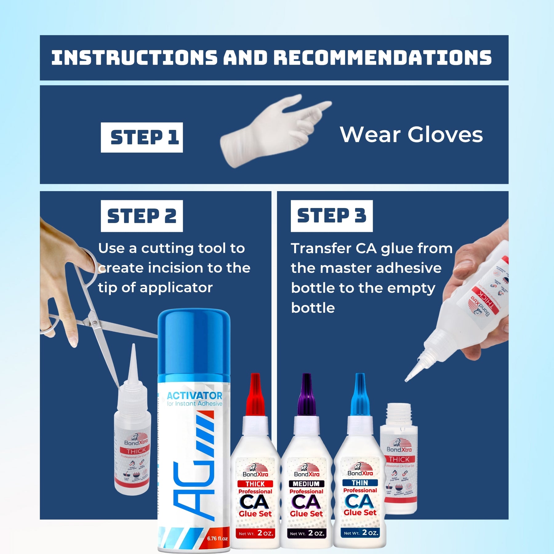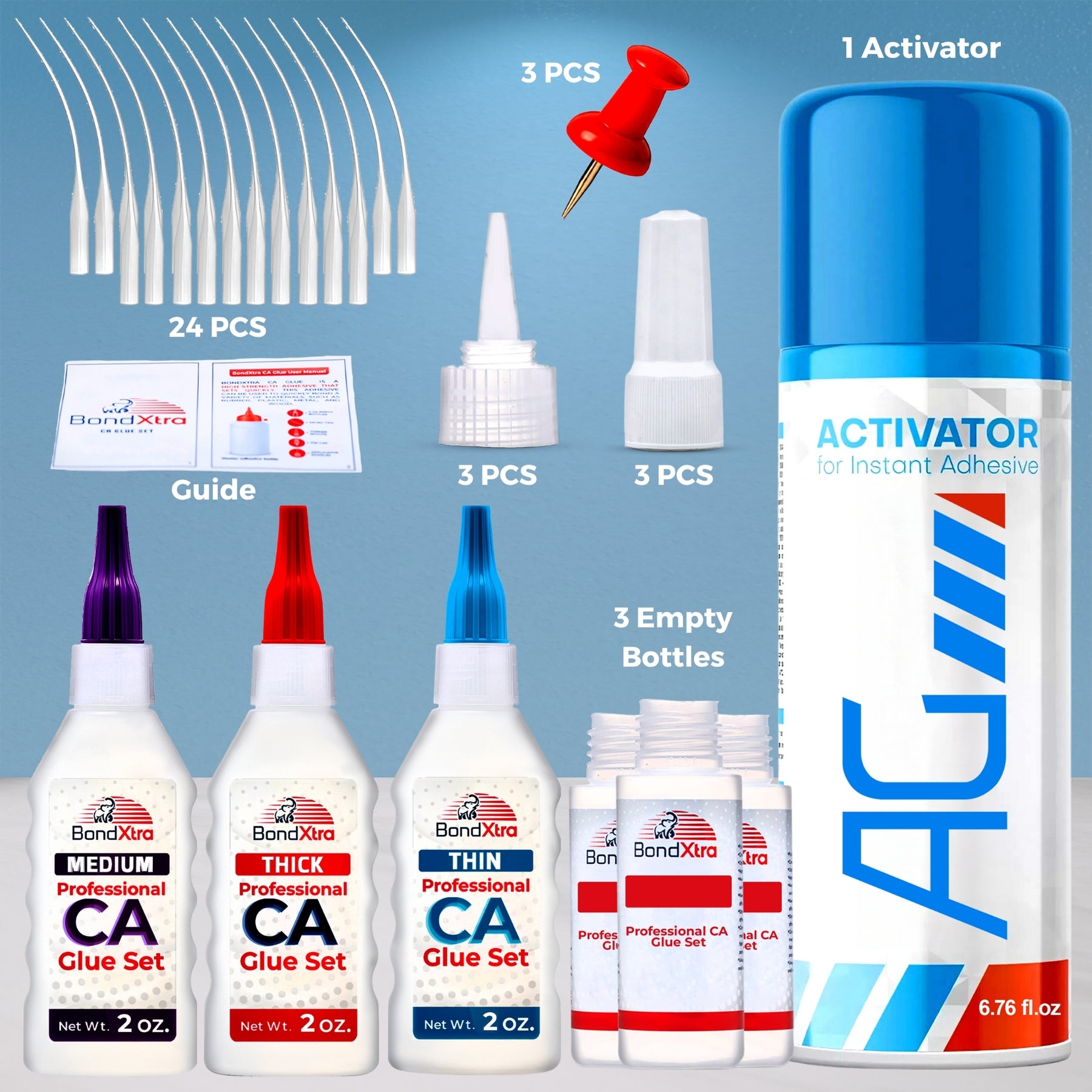 - · Box Content: 1 BX2 Thick CA glue (2 oz), 1 BXM2 Medium CA glue (2 oz), 1 BXT2 Thin CA glue (2 oz), 1 AG220A Activator spray (6.76 fl. oz), 24 micro tips, 3 empty bottles, 3 yorker spouts, 3 extra caps, 3 push pins, instruction guide