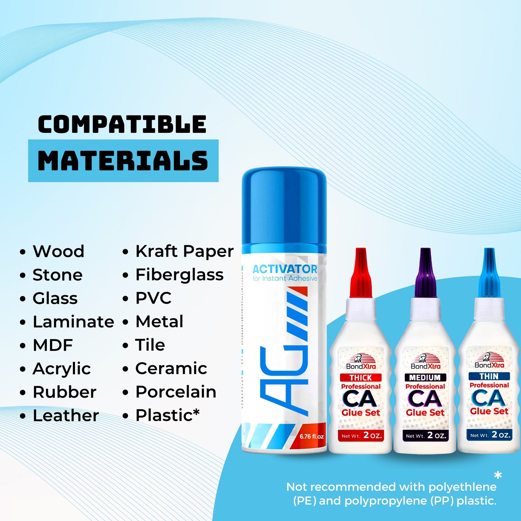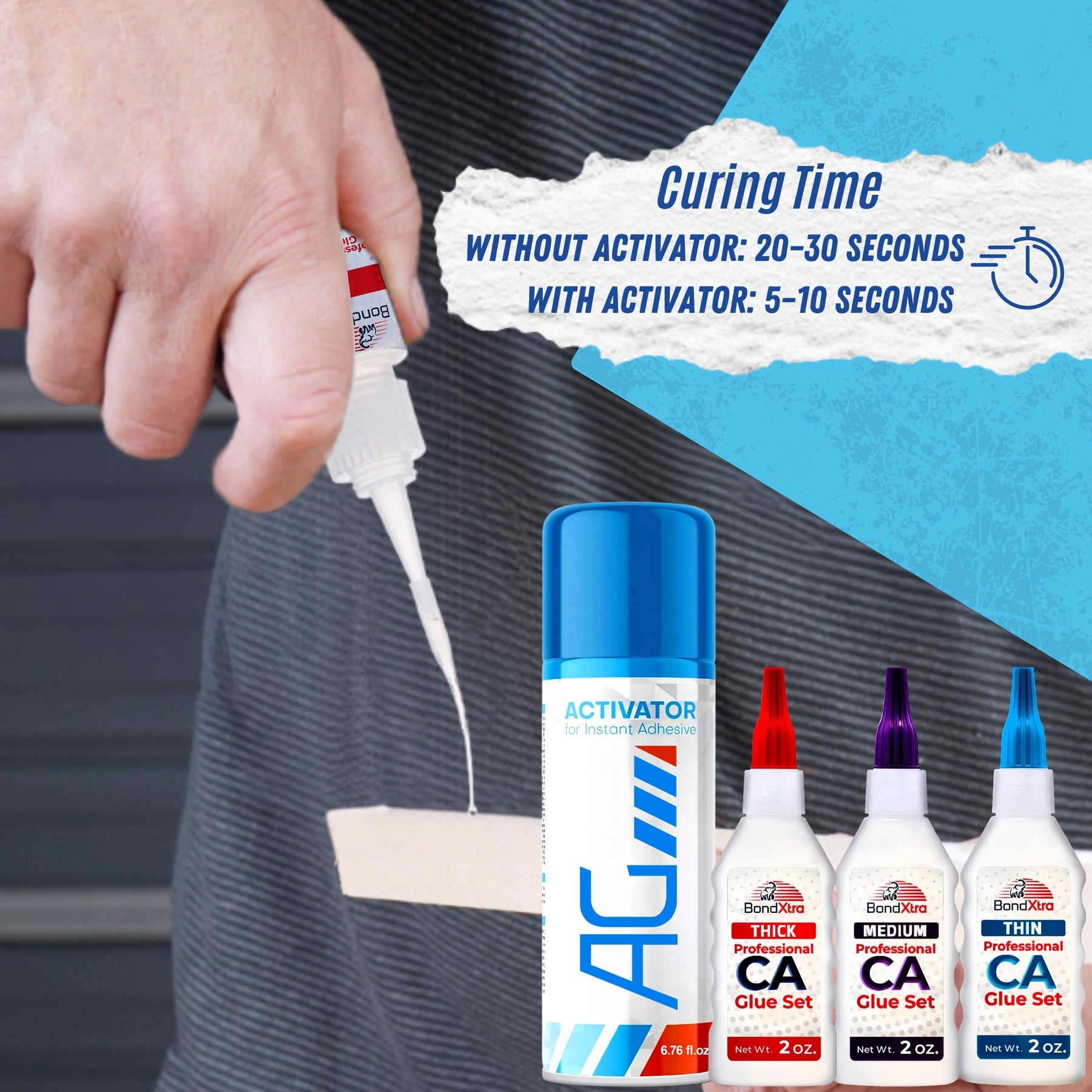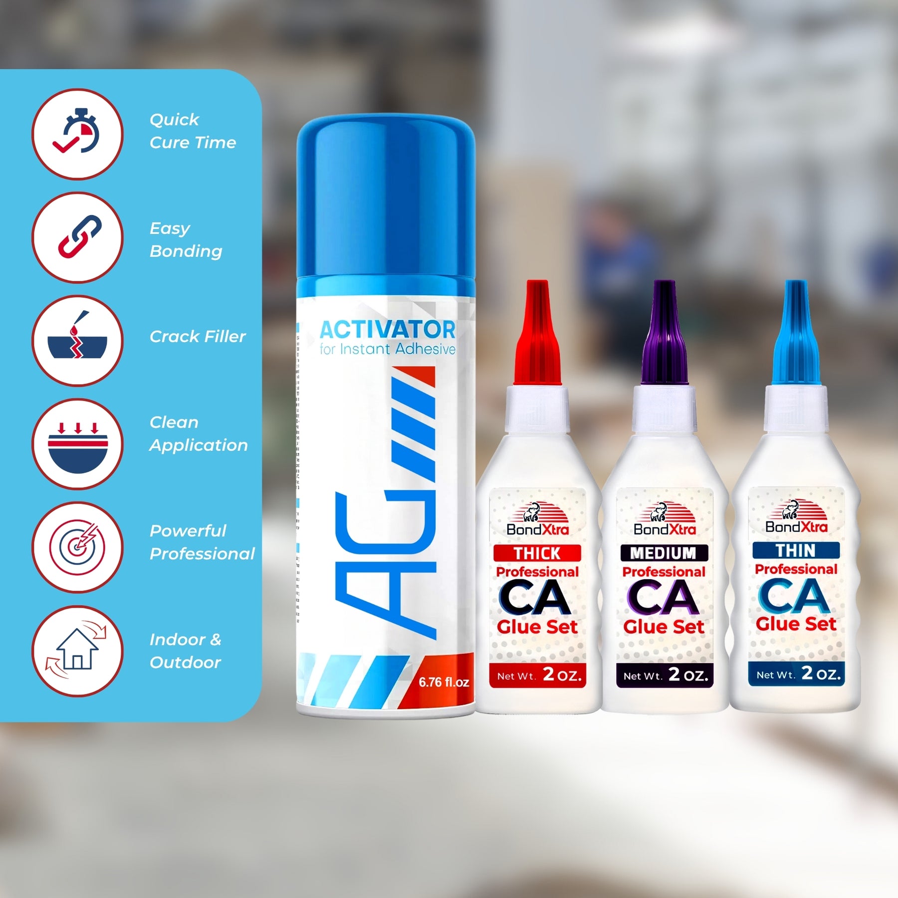 Experience fast, reliable bonding with this professional BONDXTRA BXMix2 CA Glue Set featuring thin, medium, and thick viscosities for precision control on any project. Having all three formulas in one set gives you the flexibility to handle everything from hairline cracks and tight joints to gap filling and heavy-duty bonding-making it a complete solution for woodworking, crafts, and repairs. Each glue offers strong, instant adhesion on wood, metal, glass, plastic, rubber, ceramic, and more. The included AG Activator Spray reduces curing time from 20-30 seconds to just 5-10 seconds, allowing quick assembly and clean results. This all-in-one set enhances accuracy and ease of use with micro tips, empty refill bottles, yorker spouts, extra caps, a push pin, and a step-by-step instruction guide. Designed for hobbyists, DIYers, and professionals who need dependable, fast-setting adhesives for detailed and high-strength applications.