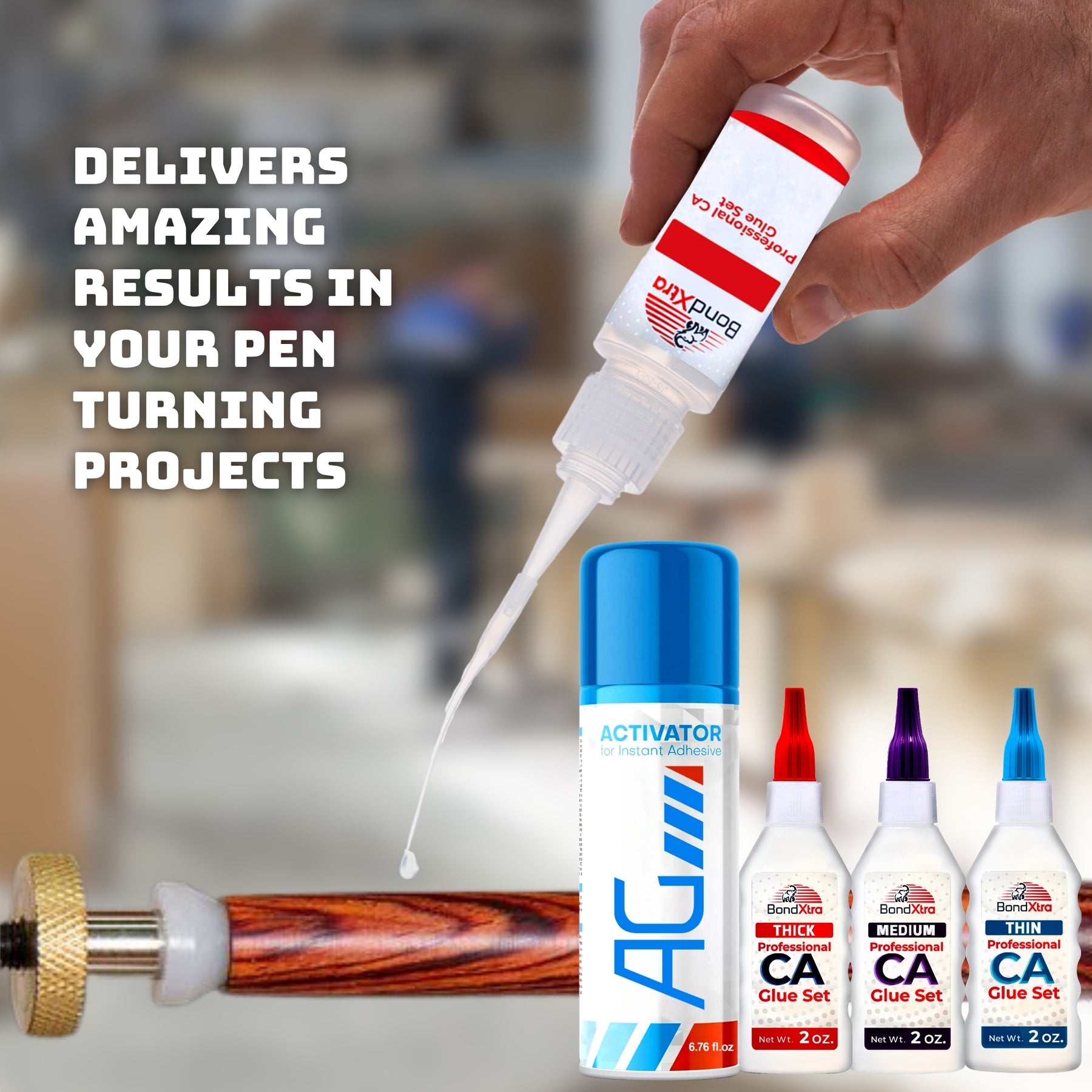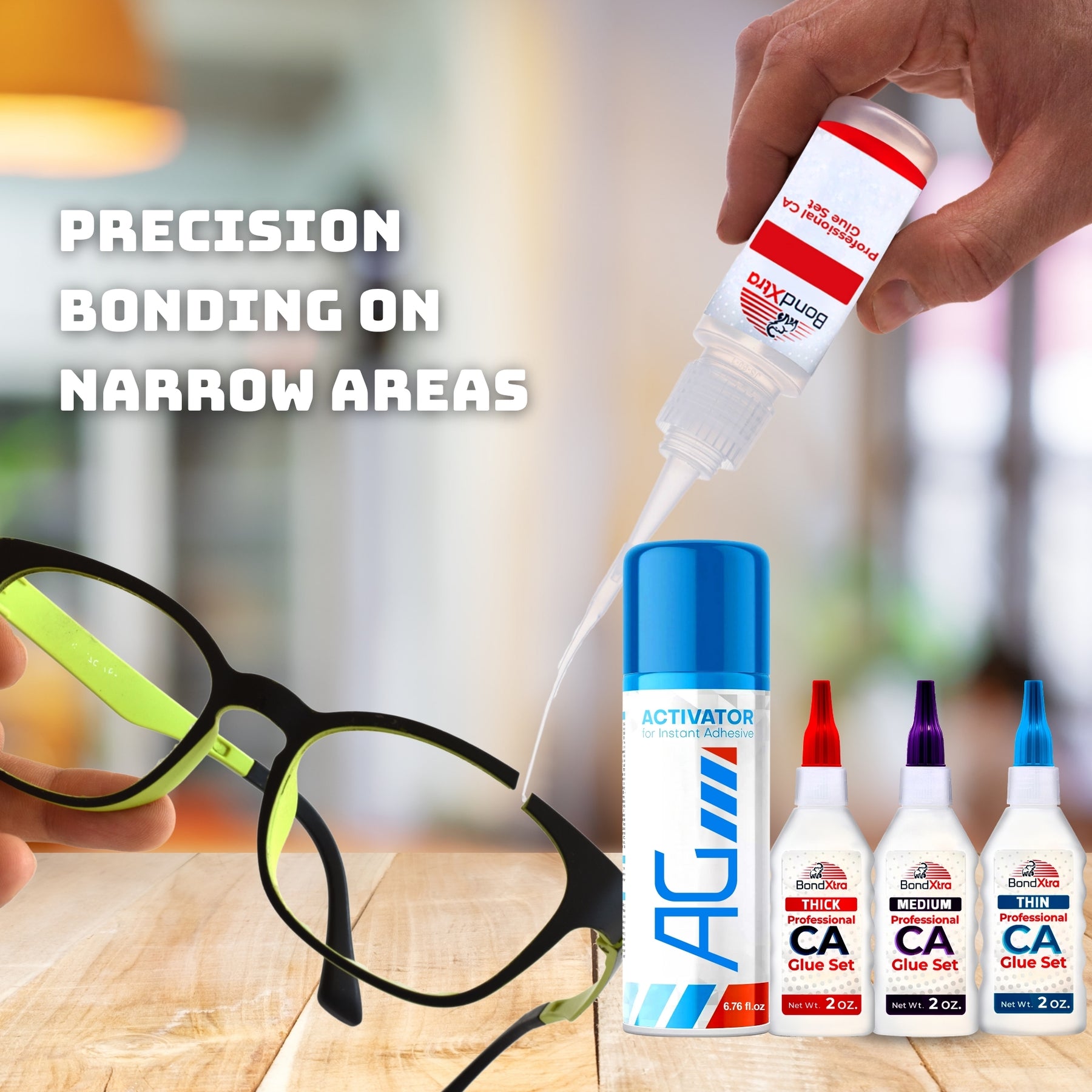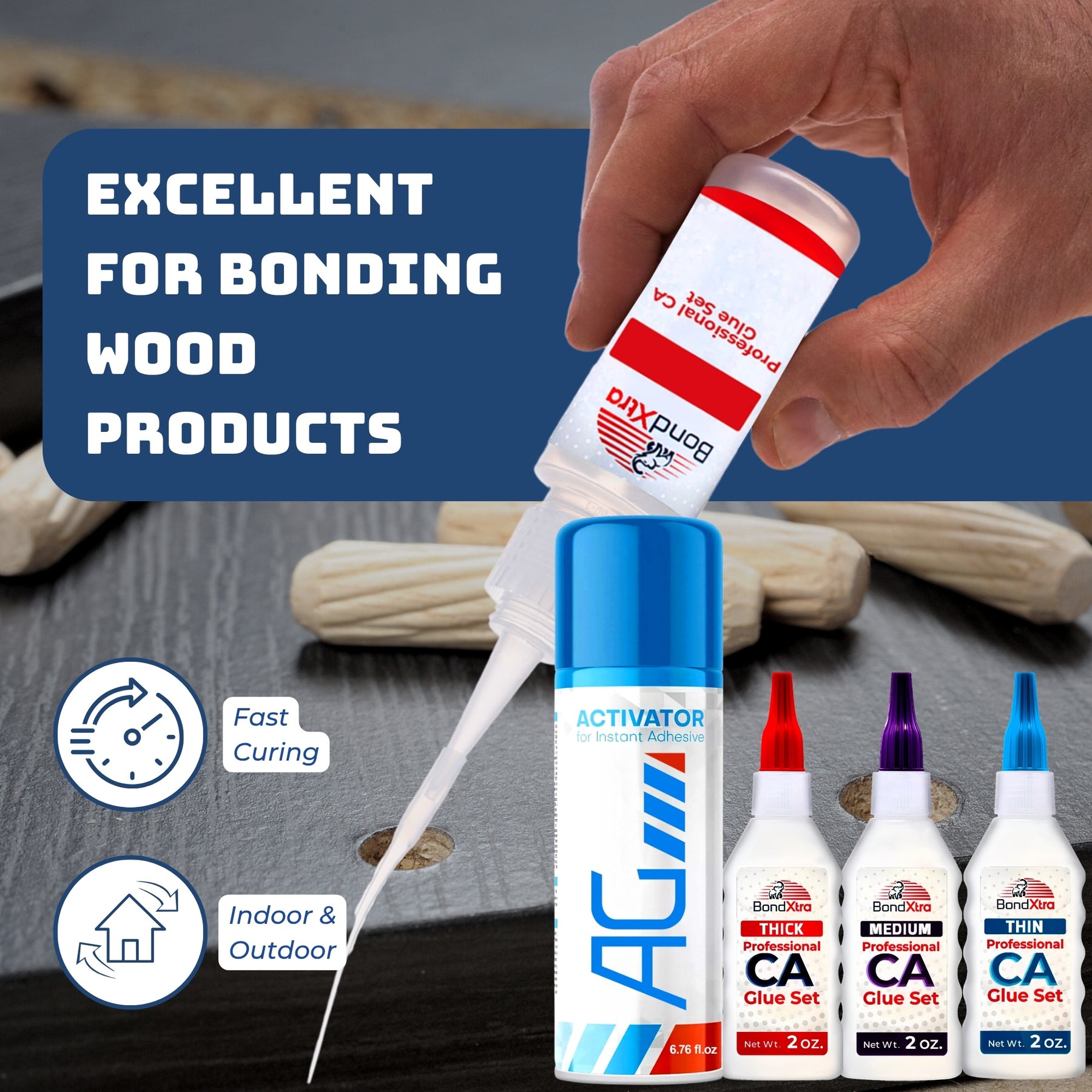 Experience fast, reliable bonding with this professional BONDXTRA BXMix2 CA Glue Set featuring thin, medium, and thick viscosities for precision control on any project. Having all three formulas in one set gives you the flexibility to handle everything from hairline cracks and tight joints to gap filling and heavy-duty bonding-making it a complete solution for woodworking, crafts, and repairs. Each glue offers strong, instant adhesion on wood, metal, glass, plastic, rubber, ceramic, and more. The included AG Activator Spray reduces curing time from 20-30 seconds to just 5-10 seconds, allowing quick assembly and clean results. This all-in-one set enhances accuracy and ease of use with micro tips, empty refill bottles, yorker spouts, extra caps, a push pin, and a step-by-step instruction guide. Designed for hobbyists, DIYers, and professionals who need dependable, fast-setting adhesives for detailed and high-strength applications.